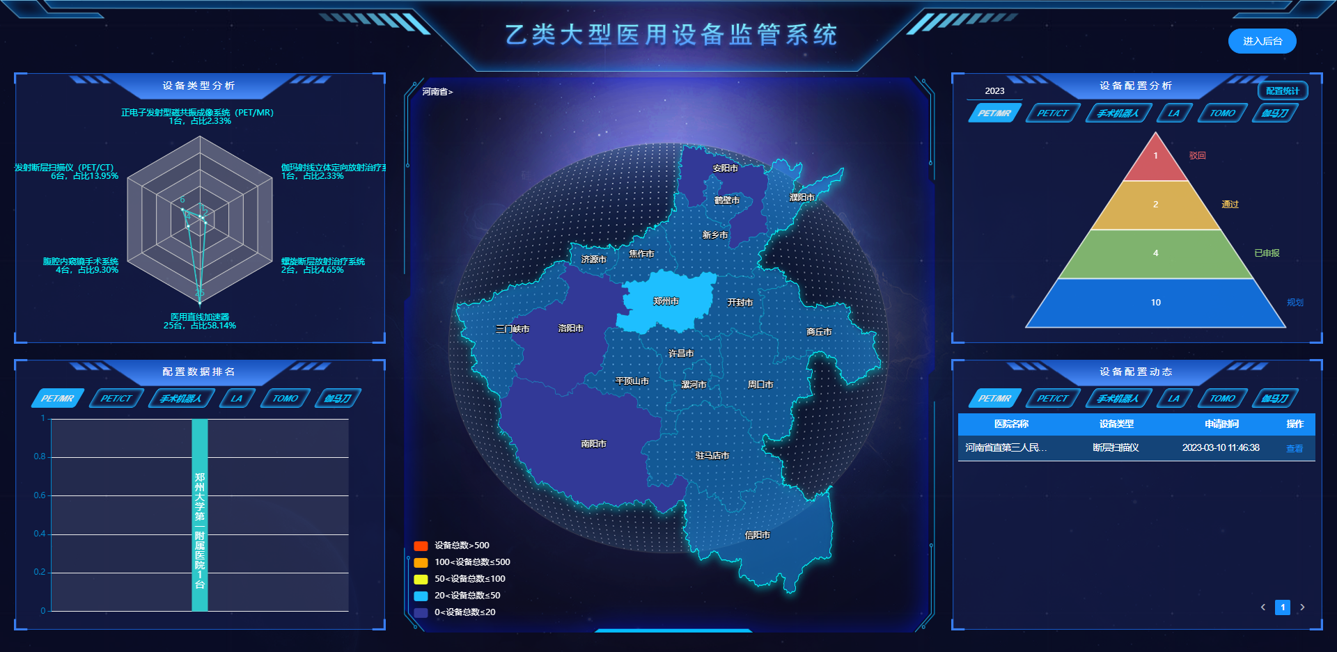 通過系統(tǒng)建立全省乙類大型醫(yī)用設備信息臺賬、醫(yī)療機構信息臺賬、設備配置信息臺賬、評審專家?guī)欤⑼ㄟ^可視化圖表展現(xiàn),為后續(xù)全省配置規(guī)劃和許可審批提供數(shù)據支撐。